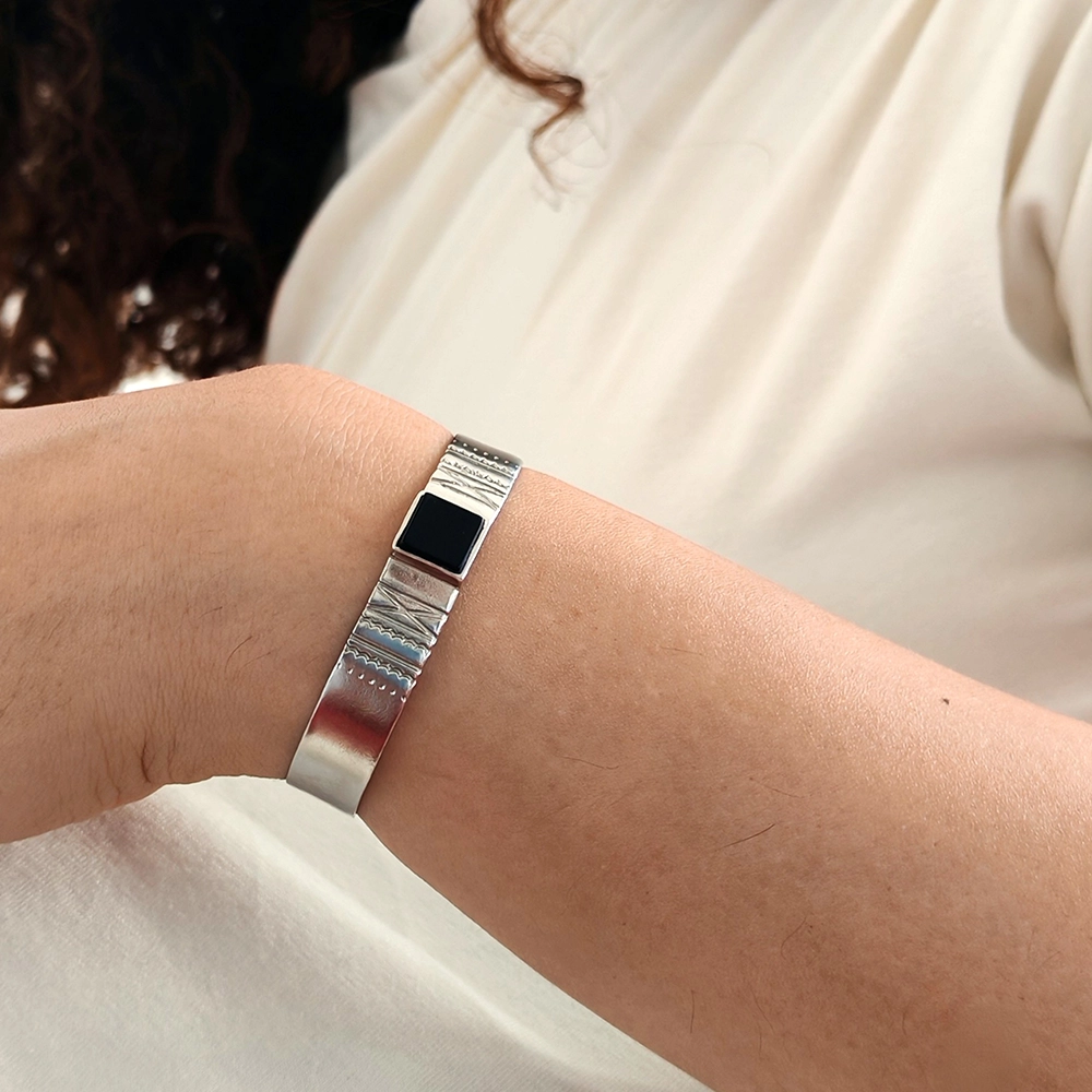 La bague bandeau Dune est une pièce qui parle pour elle même, à la fois douce et féminine avec ses rondeurs semblables aux formes changeantes des dunes du Sahara, et unique avec ses gravures traditionnelles invoquant de lointains échos du désert; elle ajoute une touche d’élégance mystérieuse à vos doigts.